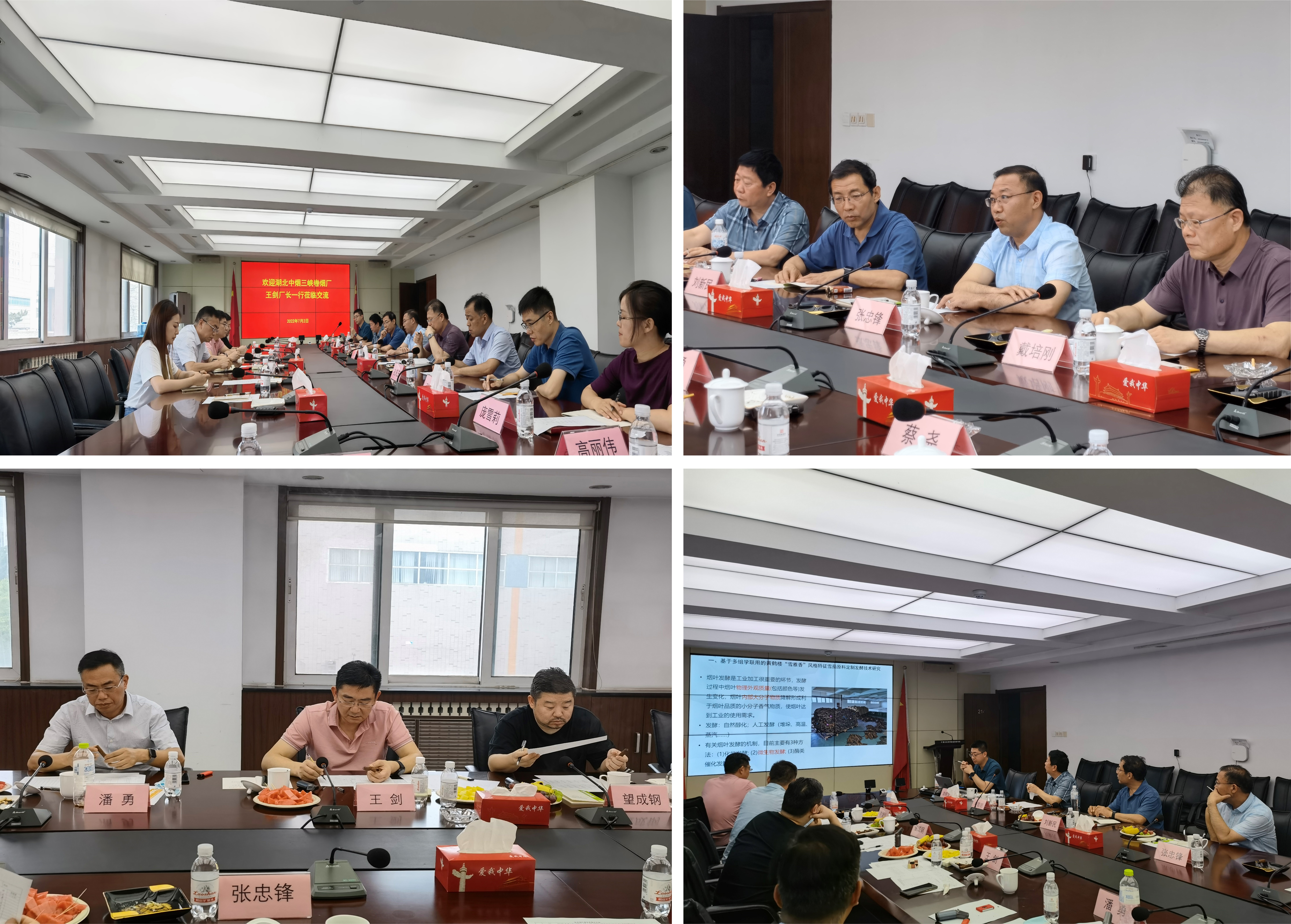 2022年7月2日,湖北中烟三峡卷烟厂厂长、党委委员、雪茄首席专家王剑等一行4人到中国农业科学院烟草研究所座谈交流。烟草所所长张忠锋、副所长戴培刚、植物功能成分研究中心主任刘新民、质量安全研究中心主任孔凡玉及相关人员参加交流。