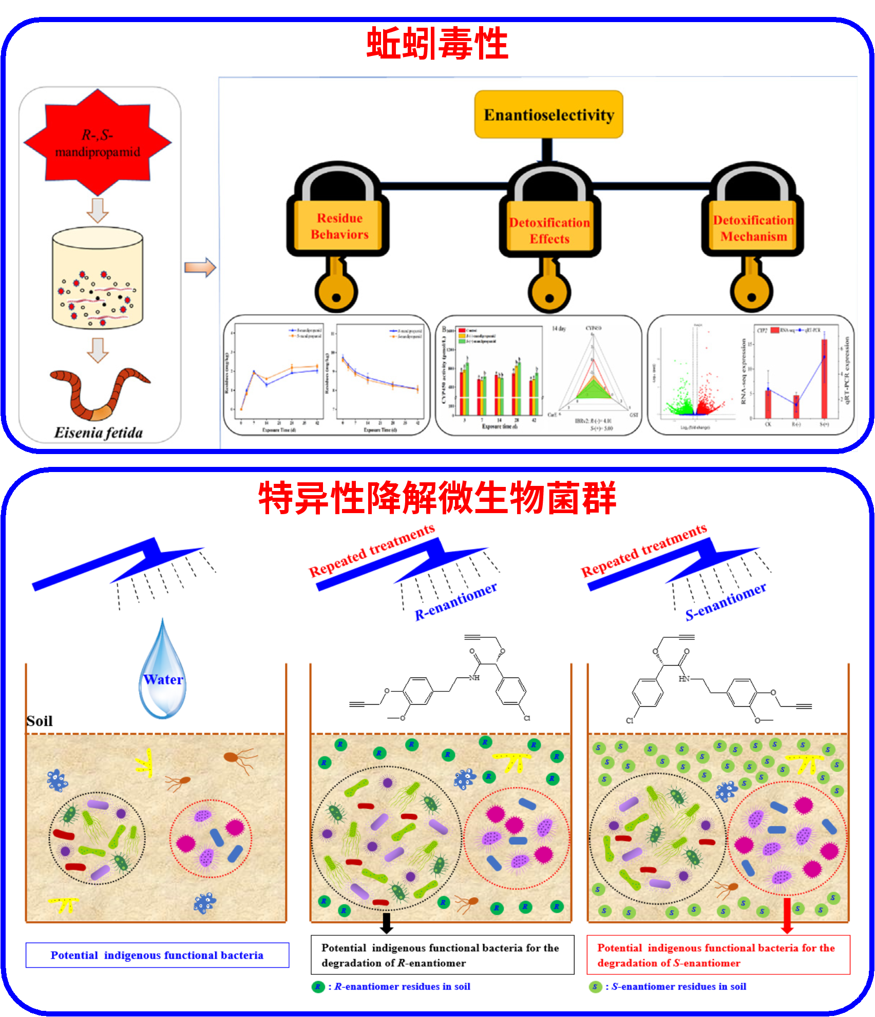 该团队以全球广泛使用的酰胺类杀菌剂为研究对象,在对映体水平上,采用模式生物蚯蚓进行毒性效应评价。研究发现,酰胺类杀菌剂双炔酰菌胺S-对映体在蚯蚓体内更易富集,进而显著影响了蚯蚓体内的胆汁代谢途径等相关基因的表达差异,导致S-对映体对蚯蚓的毒性显著高于R-对映体。在此基础上,通过宏基因组测序和qPCR方法,进一步挖掘了土壤中潜在的双炔酰菌胺降解微生物菌群,明确了伯克霍尔德菌(Burkholderia)、副伯克霍尔德氏菌(Paraburkholderia)、生丝微菌(Hyphomicrobium)和甲基杆菌(Methylobacterium)是导致双炔酰菌胺对映体选择性降解的主要微生物功能菌群。研究结果为酰胺类杀菌剂的安全合理使用以及污染土壤的微生物修复提供了重要基础数据。